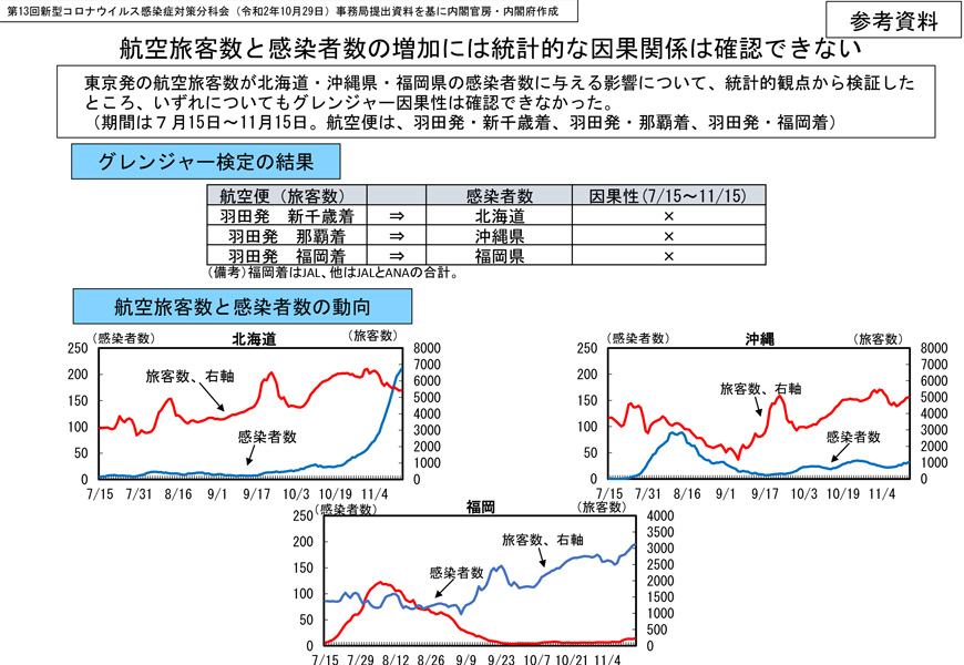 3.GoToトラベルという政策を通じて(地域などで)流行が起こった(キャンペーンがなければ起こらなかった) 上記に加えて、感染症は伝播することが特徴であるから、間接的な被害対象(GoToトラベル利用者の感染者から2次感染・3次感染が起こった関係者や第三者。さらに、GoToトラベルで旅行者が訪れた街の隣町など)もたどることができれば重要な追加情報になり得る。 さらに、別の意味での政策インパクトとしての間接的な因果であるが、GoToトラベルの推奨に伴うヒト移動全般の活発化が起こることも間接的影響の一部と考えられる。つまり、GoToトラベルを実施すると、通常の心理としては「旅行してもいいのだ」として緩和ムードが増したと感じることにつながる。それによって利用者以外も含めて移動が活発化する。直接的因果ではないが、間接的な政策的インパクトが確かならば為政者はその点に配慮して分析・判断すべきなのは当然である。 残念ながら、1に関しては十分な調査がされていない。確実に把握していないが、事前の観察研究デザインも十分でなかったと思われる。観光庁が集積しているデータで、官邸関係者が報道等で言及しているものは1に相当する。ただし、このデータは調査方法が公開・明示されておらず、感染症法のように宿泊施設等の事業者が届け出をしないことによる罰則規定もない。そのため、十分に制御をした上で観察する手段を作った上で政策を履行しなければ、感染に係る情報が選択的に業者によって報告されることを抑制する「報告バイアス」がかかった統計になってしまう。加えて、8月5日の観光庁見解では事業者の風評被害に配慮して「公表しない」方針を明確にしていた。それにもかかわらず、11月10日に延長する際に初めて「131人である」という合計値の発表のみがなされた。 1が十分にわからないときでも、2や3については様々な周辺データで検討が可能である。内閣官房・内閣府が作成したグレンジャー検定を用いた資料は、2と3の中間的な意味合いでの「感染者数」と東京からの航空旅客数との間での検討結果である。2や3のような時系列データを基にした因果関係の立証は、1よりも因果の強さとして反証に耐えられない弱さも兼ね備えている。 例えば、第1次GoToトラベルキャンペーンは政治判断によって7月22日から前倒しして実施されたが、実施日と4連休が重なっていた。その場合、仮に当該日付以降に感染者数が増えたとしても「単に4連休があったからだ。GoToだけではない」という理屈自体は成り立つ(しかし感染を制御する視点からすれば、感染者が増えているならば「GoToの影響がない」とは口が裂けても言えない)。同じような苦悩として、3について流行拡大が見られても、他の対策の変化との関係は単純には切り離せない。例えば、東京都を対象地域に追加した10月1日開始の第2次GoToキャンペーンと国際的なヒトの往来に関する「留学」、「家族滞在」などの緩和は同タイミングで実施されている。気温が次第に低下していて感染性が高くなる傾向にあることも影響する。