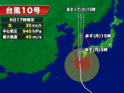 大型で非常に強い台風10号の影響で、東海地方では6日夜から8日にかけて雷を伴う非常に激しい雨が降る見通しです。気象台は、高波や土砂災害などへの警戒を呼び掛けています。 台風10号は6日午後4時現在、鹿児島県の屋久島付近を時速35キロのスピードで北に進んでいます。 この影響で、東海地方でも8日にかけ局地的に雷を伴った非常に激しい雨が降る見込みで、7日午後6時までの24時間に予想される雨の量はいずれも多いところで、三重で400ミリ、愛知と岐阜で200ミリとなっています。 三重県や愛知県の海上では最大瞬間風速30メートルの風が吹くと予想され、海上はうねりを伴った大しけとなる見込みで、現在三重県南部に波浪警報が出されています。 また、津市に大雨警報が、東海3県全域で雷注意報が出されています。 気象台は、高波や土砂災害、低い土地への浸水などに警戒を呼びかけています。交通機関にも影響が出ています。 東海道新幹線は7日の始発から山陽新幹線と直通する列車100本が新大阪駅もしくは岡山駅の発着に変更されます。