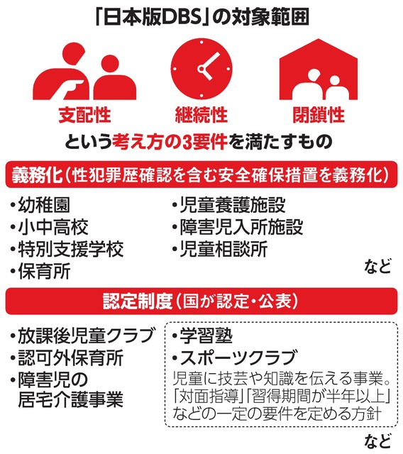子どもと接する職場に、従業員らの性犯罪歴を確認させ、就労を制限する――。「日本版DBS」とも呼ばれる新制度の創設に向け、こども家庭庁が「児童対象性暴力防止法案」の骨子案をまとめました。与党との調整を経て、今国会に法案提出したい考えです。ポイントを解説します。