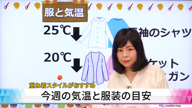 ただ、最高気温は、25℃以上の半袖の陽気となる日が多くなっています。服装で上手に調節して体調を崩さないようにお気を付け下さい。 今週は、秋雨前線が日本の南に位置するため、日本列島はその北側の秋の空気に包まれる見込みです。 このため、最高気温が30℃以上の真夏日となる所は少なくなりそうです。西日本や東日本では28℃前後、東北は25℃前後の日が多くなるでしょう。最低気温は、西日本や東日本でも20℃以下となる日が多くなる見込みです。 服装選びの目安は、25℃以上が半袖、25℃未満~20℃以上が長そでのシャツ、20℃を下回るとカーディガンやジャケットがちょうどよいと言われています。 西日本や東日本では、朝は20℃以下となりますが、日中は25℃以上で半袖の陽気となりそうです。今週は重ね着や羽織るものを持つなど服装選びに気を付けて、体調を崩さないようにお気を付け下さい。