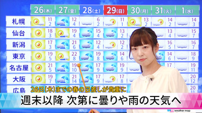 29日(日)は、いったん晴れ間の広がるところが多くなりそうですが、週明けは、再び曇りや雨の日が多くなる見込みです。