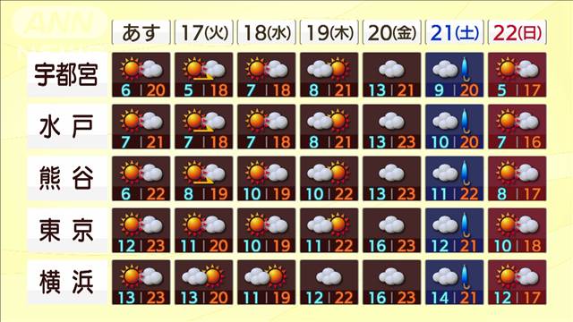 続いて、16日の気温を見ていきます。16日朝は15日よりも冷え込みが緩みますが、それでも北部中心に一桁です。日中は15日より高く、広い範囲で20度以上。東京など南部は23度です。朝晩と日中の気温差が10度前後と大きいので服装や体調管理にはお気を付け下さい。