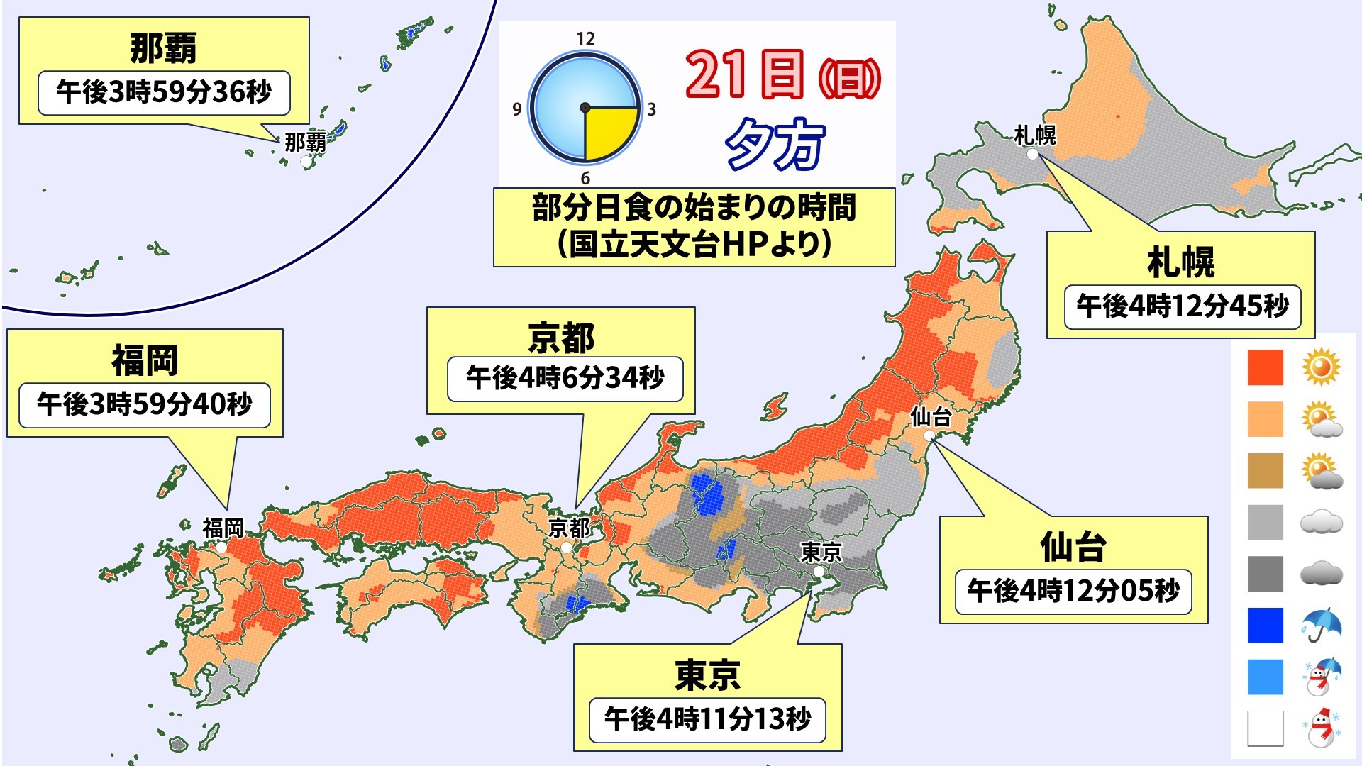 あす21日(日)は高気圧に覆われ全国的に晴れる所が多い予想。ただ、関東甲信は湿った空気が流れ込み雲の広がりやすい一日となる見通し。夕方には全国で部分日食が起こるが、関東は空模様と相談しながらの観察となりそうだ。
