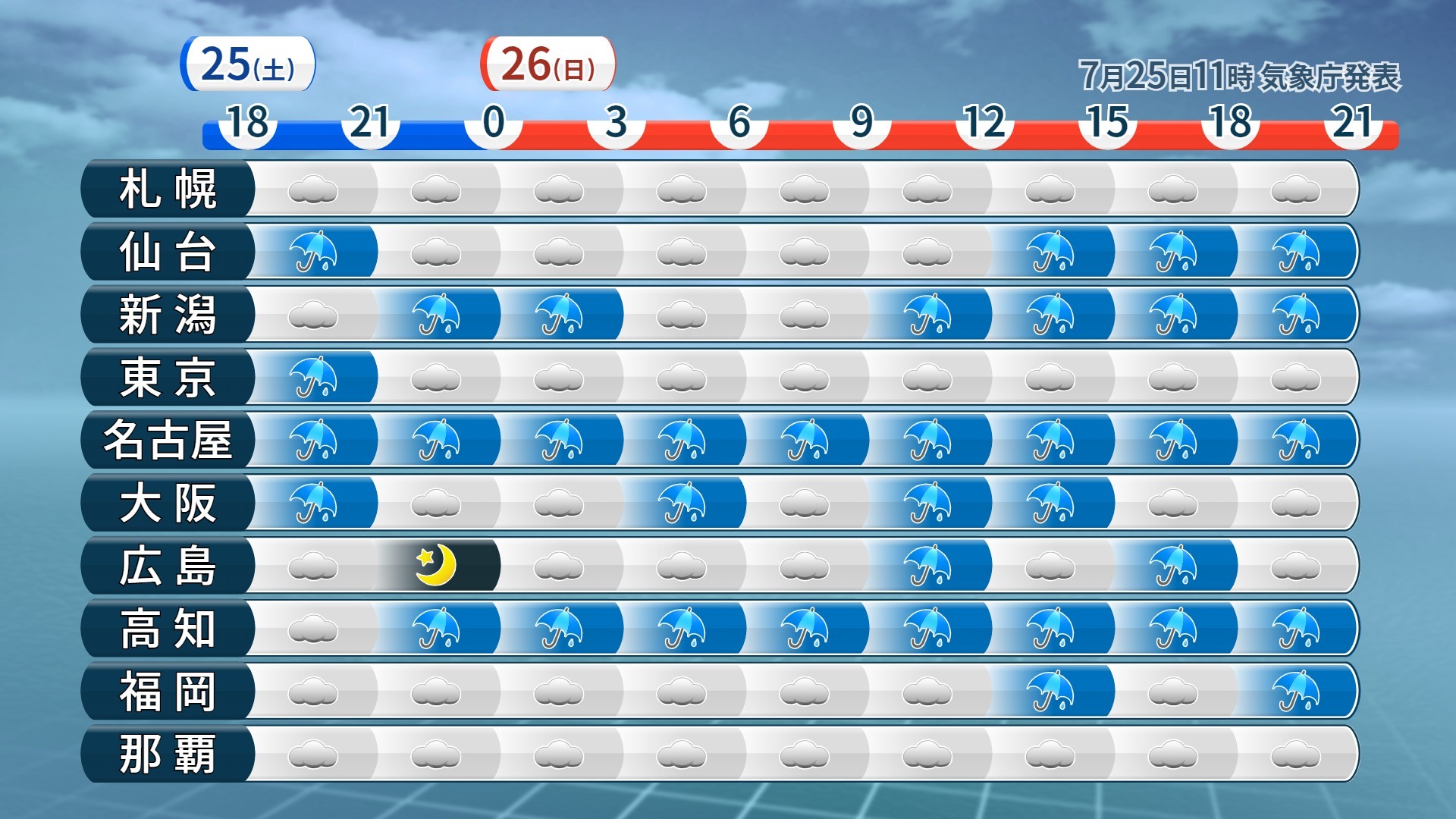 あす26日(日)にかけても、西・東日本を中心に雨が降り、特に太平洋側で局地的に雨雲が発達し大雨となるおそれがある。