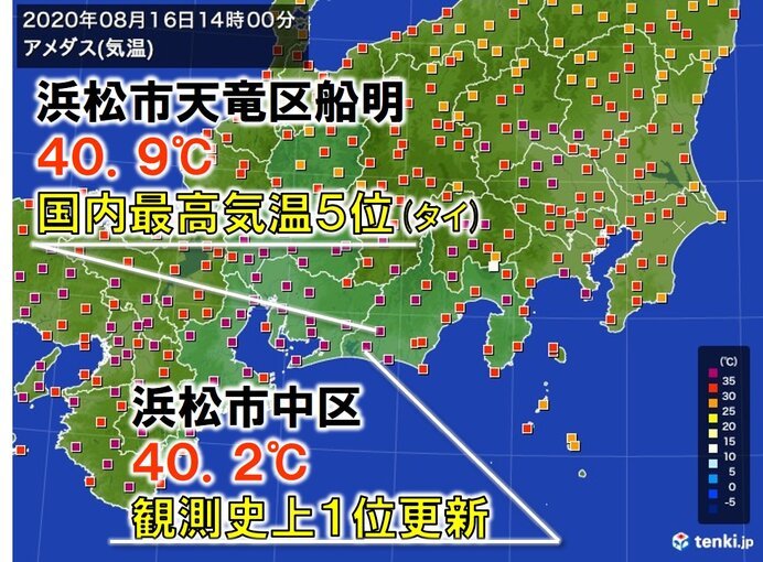 きょう8月16日は、静岡県浜松市周辺で40度を超える記録的な暑さとなりました。午後0時半過ぎに浜松市天竜区船明(ふなぎら)では、国内記録歴代5位タイとなる40.9度まで上がりました。また、浜松市中区では午後3時過ぎに40.2度まで上がりました。浜松市の市街地で気温が40度台となるのは初めてです。