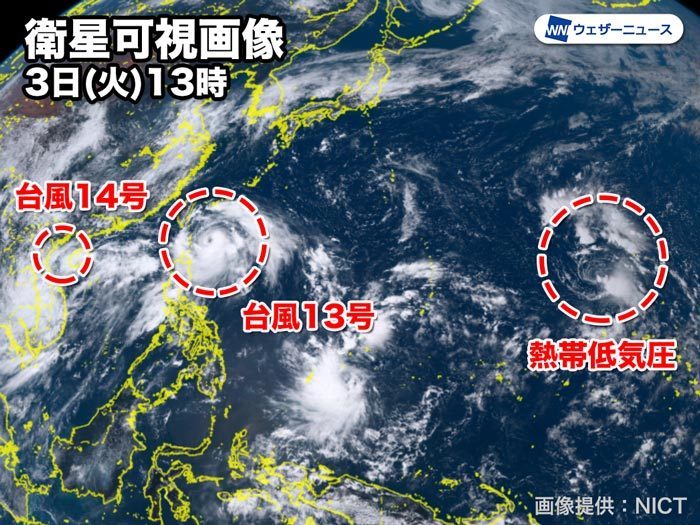 昨日2日(月)は台風13号、今日3日(火)に入り台風14号と立て続けに2つの台風が発生しました。