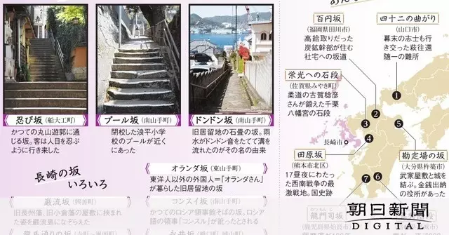 三方を山に囲まれ、天然の良港として栄えてきた長崎市は、市街地の7割を斜面地が占める坂のまちだ。宅地向きの土地は少なく、日々の上り下りはきつい。それでも、名前のついた坂を歩くと、ハッとするような景色に出会い、まちの歴史も見えてくる。長崎の坂を知り尽くす「達人」に案内してもらった。