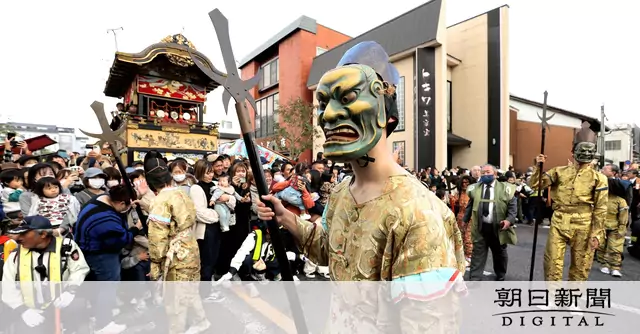 この日午後、だんじり9基が集まる幹線道路に鬼行列の先頭が到着。だんじりに乗る囃子(はやし)手が笛や太鼓などで楽曲を奏でて盛り上げる前を、行列がゆっくりと通過した。