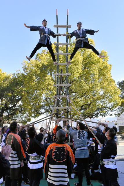 はしご乗りは、高さ6メートルのはしごの上で様々なポーズを取る。10代から40代までの6人が「しゃちほこ」「大の字」などの大きな技を次々と繰り出した。この2年ほどはコロナ禍で、披露する機会がなかったという。技を指導した組頭の岡部昇さん(71)は「久しぶりだったが、よくできた。安心して見ていられた」と話した。(吉沢龍彦)