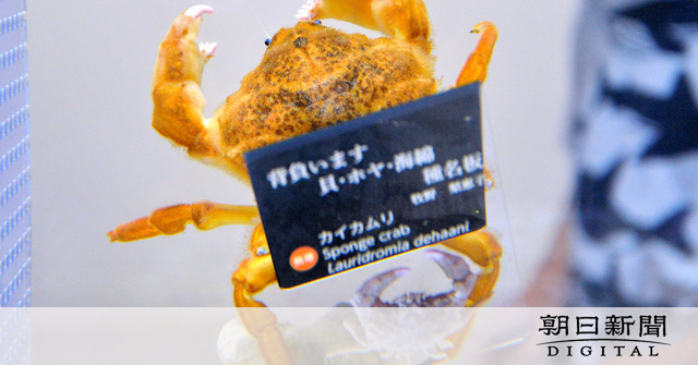カイカムリは外敵から身を守るため、貝殻や海綿などを背負い、身を隠す習性で知られる。水槽内には貝殻もあるのに種名板を選んでいるという。その姿を7月、客がSNSに投稿したところ、「自己紹介してあるいてるの可愛い」「一族の名を背負って…! なんて健気(けなげ)なんだぁ…」などの反応が寄せられ、一躍、人気者になった。