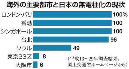 国交省によると、パリや香港、ロンドン、シンガポールといった主要都市の無電柱化は軒並み100%。台湾の台北も96%と高水準だが、大阪市は6%で、東京23区でもわずか8%(国内の数値は平成29年度末の国交省調べ)にとどまる。