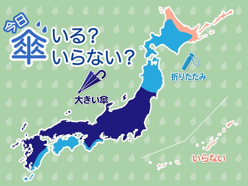 四国など西日本の太平洋側は、比較的雨雲が流れ込みにくいため、折りたたみ傘で良さそうです。 梅雨前線の北上に伴い、東北も段々と天気は下り坂に向かいます。また、低気圧が接近する北海道は、夜遅くに雨が降り出します。帰りが遅くなる方は折りたたみ傘をお持ちください。