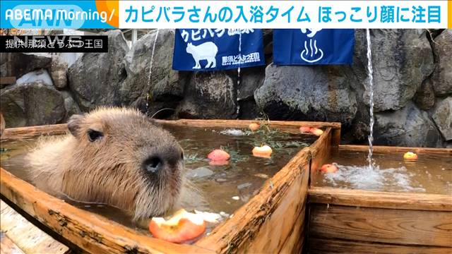 寒い時期の風物詩、カピバラのお風呂が始まりました。カピバラが風呂好きなのには理由があります。 暖かそうに見えるお風呂。実は約35度のぬるま湯です。栃木県の那須どうぶつ王国によりますと、カピバラはもともと南米、アマゾン川流域に住んでいて、ぬるいお湯につかる習慣があります。なので基本的にカピバラはお風呂好きだということです。先週に始まったカビバラのお風呂は来年3月まで見ることができます。