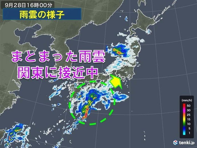 9月最後の週末を迎えているきょう28日の関東地方。午前中は青空の面積が広く、穏やかな天気でしたが、午後になると雲が広がっています。昼頃にかけて九州の一部に非常に激しい雨を降らせたまとまった雨雲が近づいているためです。西日本ほどの強い雨が降ることはないとみられますが、今夜は伊豆諸島の一部で本降りとなりそうです。