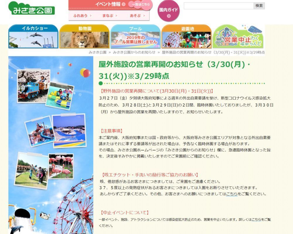 大阪府岬町の遊園地と動物園を併設する「みさき公園」を運営する南海電鉄は29日、同園の30、31両日の営業を再開すると発表した。ただ、大阪府知事または国、政府などから、府内が対象となる外出自粛要請またはそれに準ずる要請等が出た場合は、予告なく臨時休園する場合もあるとしている。同園は新型コロナウイルス感染拡大防止のため28、29両日と臨時休園。今月末で同電鉄の運営撤退と同時に営業終了・閉園することになっている。