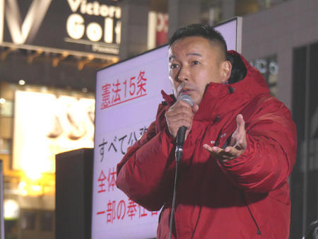 れいわ新選組の山本太郎代表は18日、年内最後となる「街頭記者会見」を、東京・新宿駅前で開いた。