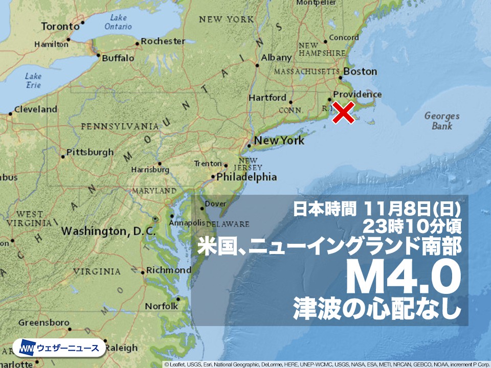 日本時間の11月8日(日)23時10分頃(現地時間の同日9時10分頃)、北米東部で地震がありました。震源地は米国、ニューイングランド南部で、地震の規模(マグニチュード)は4.0と推定されます。 震源はマサチューセッツ州のバザーズ湾付近で、州都のボストンからは南に約100km、ロードアイランド州の州都プロビデンスから南東に50kmほどの地点とみられます。 ※震源は米国地質調査所国立地震情報センター(USGS,NEIC)による。