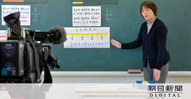「きょうは分数の勉強をしましょう」。市立坂の上小学校。6日午後、児童のいない2年1組の教室で、担任の鷹野絵理先生がちょっと緊張した顔でテレビカメラに語りかけた。青や赤の紙を折ったり切ったりしながら「二つに分けたうちの一つ分はこう書きます」と黒板に「1/2」と書いていく。