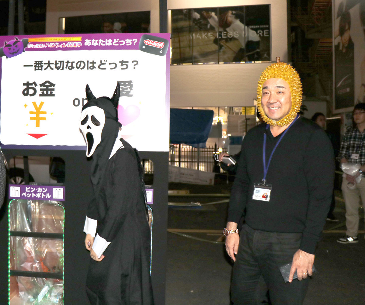 イベントには、「イモトのWiFi」のCMでおなじみの西村誠司社長を含む、同社社員11人が参加。オーダーメイドで制作した果物「ドリアン」のかぶり物で仮装した西村社長は「僕たちは渋谷で生まれた会社。ハロウィーンで渋谷の街にマイナスなイメージを持たれるのは悲しい。みんながマナーを守って楽しくハロウィーンに参加できる工夫が必要と考えて、ゴミを捨てることも楽しんでできる企画をやらせて頂いています」と、仮装をしている通行人にゴミでの投票を呼びかけた。