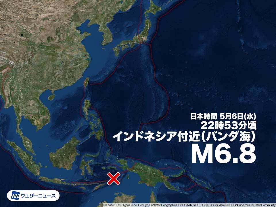 日本時間の5月6日(水)22時53分頃、インドネシア付近で地震がありました。震源地はバンダ海で、震源の深さは約110km、地震の規模はM6.8と推定されます。