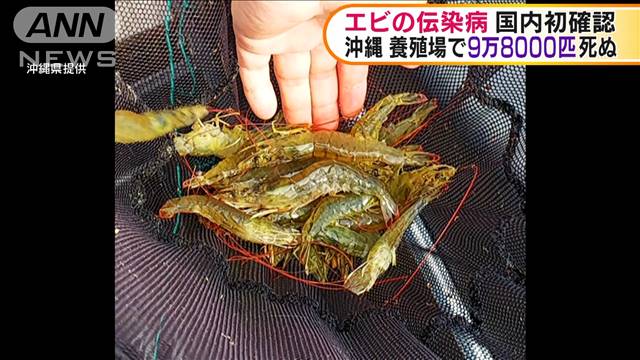 沖縄県大宜味村のエビ養殖場で、甲殻類の特定疾病に指定されている病気が確認され、エビ約9万8000匹が死にました。 この養殖場では8月にバナメイエビの養殖のため、タイから10万匹を輸入して育てていましたが、今月8日までに約9万8000匹が死にました。県の立ち入り調査で、国内では初めてとなる甲殻類の特定疾病「急性肝膵臓壊死症(かんすいぞうえししょう)」の感染が確認されました。この養殖場のエビは市場に流通しておらず、この病気が人に感染した例はないということです。県は防疫措置を行い、希望する事業者には検査を実施することにしています。