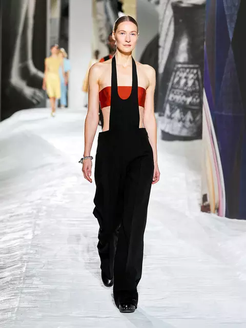 肌にぴたっと吸い付くようなトップスは、脇腹から背中にかけてぱっくりとあいていて、大胆に肌を見せている。くるくると襟が巻かれたコートや、レザーのステッチがきいたドレスやジャケットなど、細部にこだわりが宿る。(神宮桃子)