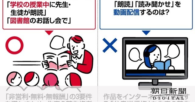 著作権法は、小学校や幼稚園、家庭内での朗読や読み聞かせを認めているが、その様子を撮影してネット配信するには作家ら著作権者の許可が必要だ。出版社は作家の意向を確認して可否を申請者に伝えているが、許可しているケースはまだ少ないようだ。