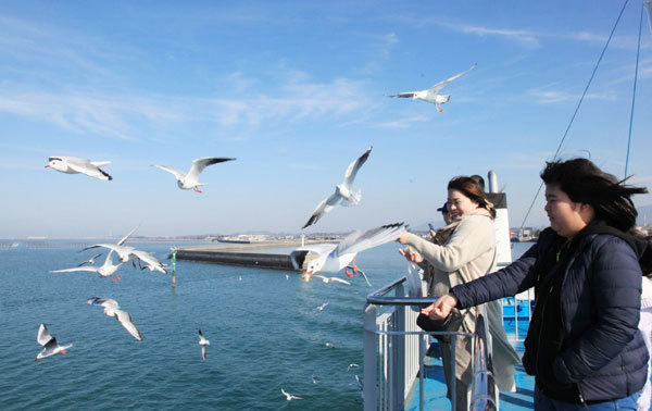 越冬のためシベリアなどから飛来するカモメの餌付けに社員が成功したのが約20年前。船内とターミナルで販売する「かもめパン」(100円)を乗客が与えるシーンも定着する。