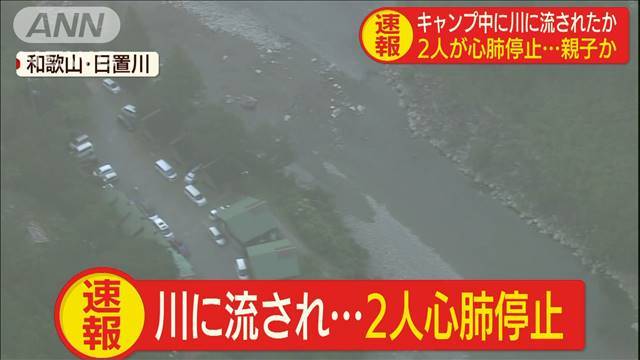 和歌山県田辺市のキャンプ場近くの川で、親子とみられる2人が川底に沈んでいるのが見つかりました。2人とも心肺停止の状態です。 20代から30代ぐらいの男性と小学生ぐらいの男の子は近くにいた人に救助されて病院に運ばれましたが、心肺停止の状態です。2人は親子とみられ、川遊びのためにキャンプ場を訪れていたということです。