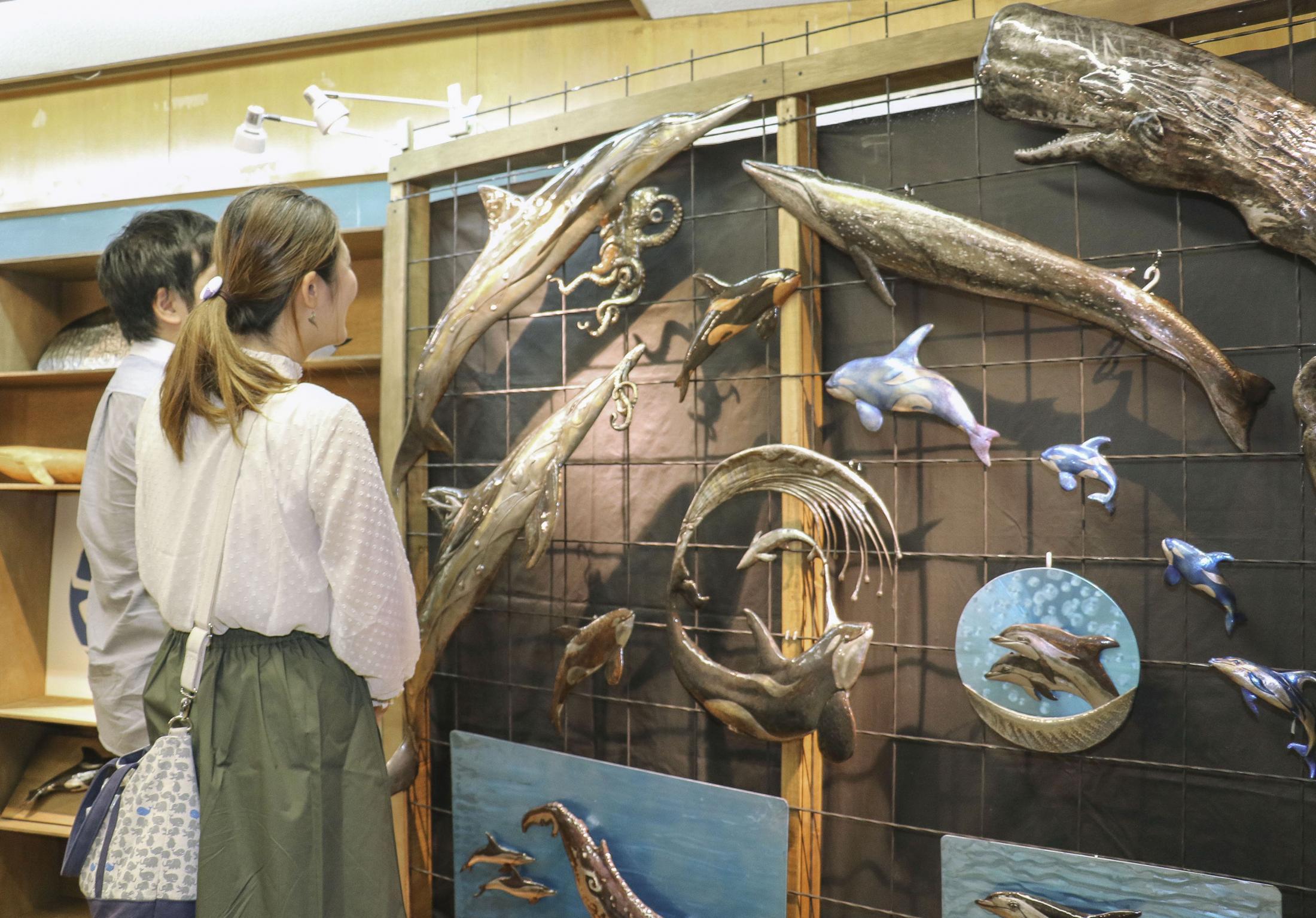 和歌山県太地町立くじらの博物館で21日、イルカやクジラを題材にした作品を制作している全国のアーティストを招き、来場者と交流してもらうイベント「くじらまみれ」が始まった。23日まで。