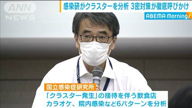 国立感染症研究所は国内で起きた6種類のクラスターについて分析した結果、換気が悪い場所で人が密集していたなど共通する要因がいくつかあったと発表しました。 感染症研究所はこれまでにクラスターが多く発生した接待を伴う飲食店やカラオケ、院内感染など6つのパターンについて分析しました。その結果、どのクラスターも換気が悪い場所に人が密集していたことやマスクを着けていない人がいたなど共通した要因があったということです。鈴木基感染症疫学センター長は「ワクチンができたとしても、コロナ対策の根幹は3密対策」だと強調し、マスクの着用や手洗いなどを呼び掛けました。このほか、緊急事態宣言が出た4月と比べて感染する人の数に対する重症者の数や致死率が低いことについては「ウイルスの遺伝情報はそのころと変わっておらず、毒性が弱まってきたとは評価できない」としました。
