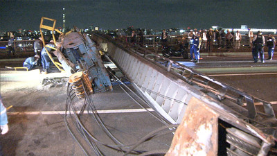 東京・葛飾区の環状7号線の橋で9日夜、クレーンが倒れる事故があり、1人が重傷を負った。
