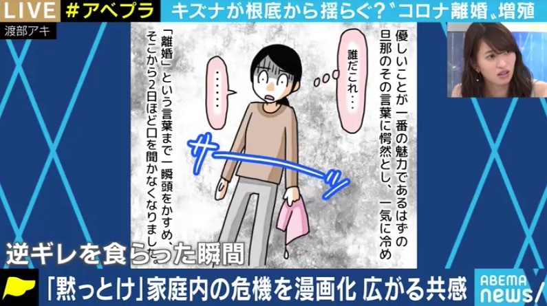 まず、既婚者のケース。イラストレーターの渡部アキさんが自身の体験を描いた漫画では、夕食時に2歳の娘がこぼしてしまったスープの後始末をお願いしていたところ、夫がほったらかしにしていたため口論に。「結婚生活の全てが一気に冷めた」という。「怒鳴られた瞬間、あ、離婚しかないってよぎった。怒鳴られることが本当に嫌で、そういうことをしない人と結婚したはずなのにって」。数日後、夫からの謝罪で仲直りしたが、仕事が減ったこと、子育てのこと、収入の不安などによるストレスが、確実に心身を蝕んでいたようだ。