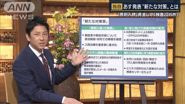 これまで新型コロナウイルス感染者は原則的に入院することになっていましたが、医療機関や保健所の負担になっていました。今回の見直しでは、軽症者や無症状者について、宿泊施設・自宅での療養を徹底し、入院治療は重症者に重点化するということです。 ◇秋・冬に向けた検査体制の拡充