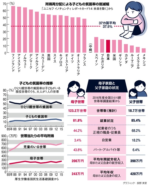 12年の子どもの貧困率は6人に1人の16・3%。15年は13・9%に改善したが、先進国でつくる経済協力開発機構(OECD)の平均13・1%(16年)より高い。