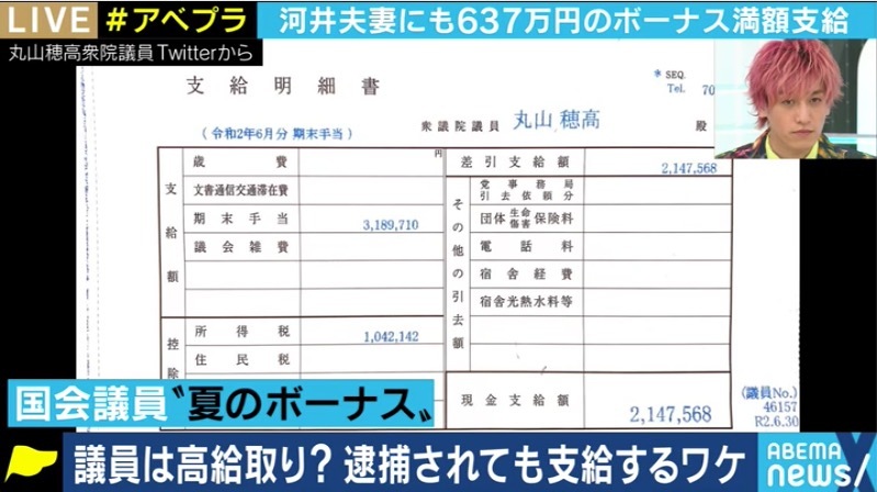 NHKから国民を守る党の丸山穂高衆議院議員が「このコロナ禍、しかも給付金10万円もまだ届いていない方が多い中、国会や地方議員に賞与支給とは」として「3,189,710円」と記された明細書をTwitterで晒し、手取り額のうち3分の1を「前澤さん的“税金還元“企画やります」と表明して話題を呼んでいる。 【映像】国会議員の報酬・待遇は適正? 現役議員と考える