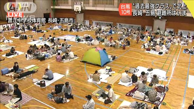 大型で非常に強い台風10号は鹿児島県の広い範囲に加えて宮崎県の一部も暴風域に入ったとみられます。長崎県五島市に設置された避難所から報告です。 (玉置佑規アナウンサー報告)