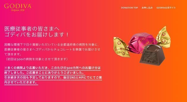 新型コロナウイルスの感染拡大が深刻になる中で、全国の医療関係者にゴディバのチョコレートがプレゼントされる。