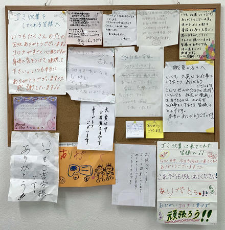 市内各所のゴミ置き場で、ゴミ袋に添えられるなどした感謝の手紙が数多く見つかり、葵区の委託会社では約30通に達した。「コロナで大変な中、ありがとうございます」、「体に気をつけて、無理をしないで。いつも感謝しております」。社内の掲示板に貼り、作業員の励みにしているという。同委託会社の望月鐘一さん(46)は「作業員を気遣う励ましの言葉ももらい、本当にありがたいです」と話す。