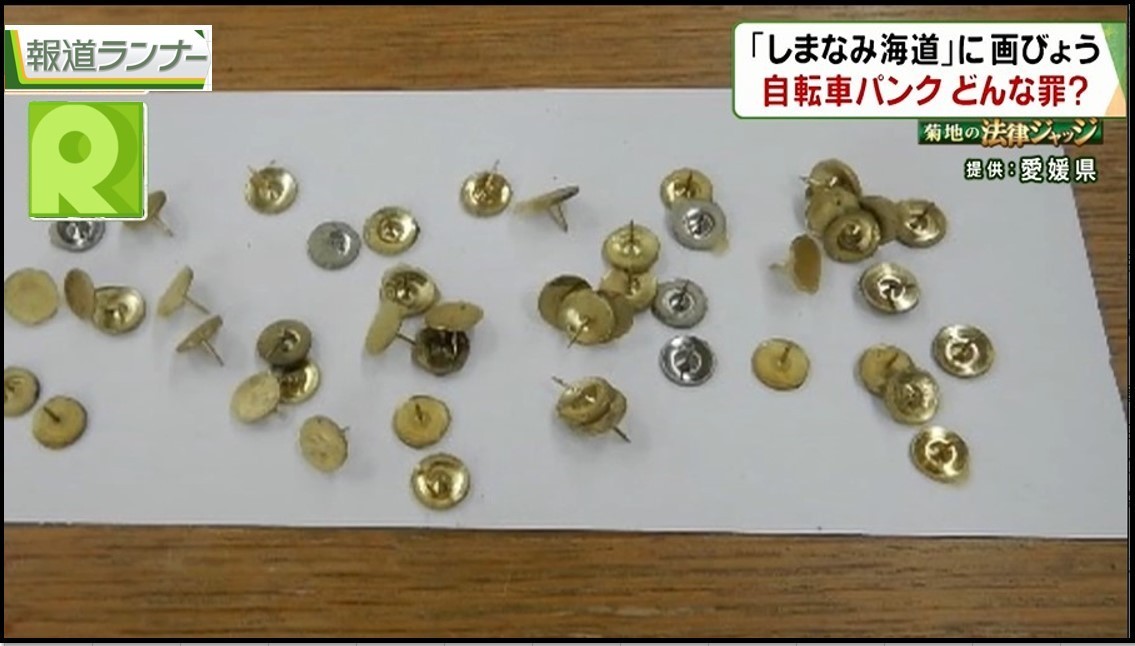 自転車のタイヤに刺さっているのは、画びょう。別の自転車にも…。この迷惑行為が起きたのは、広島県と愛媛県を結ぶ「しまなみ海道」です。