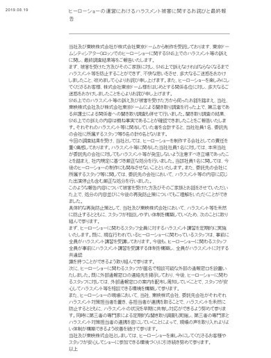 東映エージエンシーは8月19日、同社が制作を受託している東京ドームシティシアターGロッソでのヒーローショー運営に関するハラスメント被害について、最終報告とお詫びを発表しました。