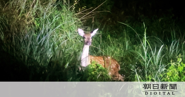 「ここからがシカスポットです。窓を開けてください」。乗員の号令で、乗客は一斉に窓を開けてサーチライトで外を照らし始めた。「左に群れがいるよ」「右にも1匹っ」。シカなどを見つけた親子連れらは大騒ぎで指をさしたり、カメラを向けたりして興奮していた。