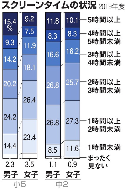 スポーツ庁は23日、小学5年と中学2年を対象にした今年度の全国体力調査の結果を発表した。各種目の成績を点数化して合計した「体力合計点」が、小5男子は2008年度の調査開始以来、最低となった。同庁は、テレビやゲーム、スマートフォンの画面を見る「スクリーンタイム」の増加と、それに伴う運動時間の減少などが背景にあるとみている。