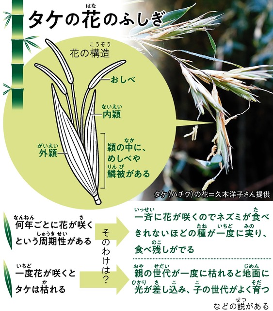 先生 まず、花を見てみようか。タケはイネ科の植物なので、花はイネとつくりが似ている。お米のもみにあたる外穎(がいえい)と内穎(ないえい)が開くと、おしべが出てきて、中をのぞくとめしべや花びらにあたる鱗被(りんぴ)がある。こんな花がいくつか集まって穂のようになって咲くのよ。でも普通は花が咲くまで何十年もかかるし、一度咲くとそのタケは枯れてしまうの。