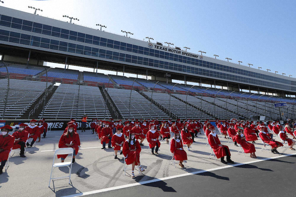 インディカー・シリーズが開催される同サーキットはオーバルで一周2・4キロ。収容人数は約19万人だが、ポンダー高校の卒業生はマスクを着用し、入場の際には「ソーシャル・ディスタンシング(社会的距離)」を遵守して、コース内に設置された各自の椅子に着席した。