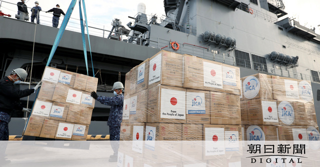 呉基地によると、搭載したのは国際協力機構(JICA)が用意した飲料水(6万リットル)やポリタンク、火山灰を取り除く高圧洗浄機60台など。新型コロナウイルス対応のため、PCR検査をした海自と陸上自衛隊の隊員計約300人が乗り、約10日かけて現地に向かう。