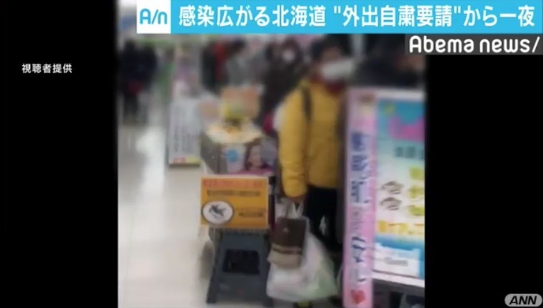 鈴木北海道知事が新型コロナウィルスの感染拡大を受け“緊急事態宣言”を出してから一夜明けた札幌。視聴者が撮影した映像では、市内のドラッグストアで大勢の買い物客がトイレットペーパーを手にし、売り切れが出ていることがわかる。