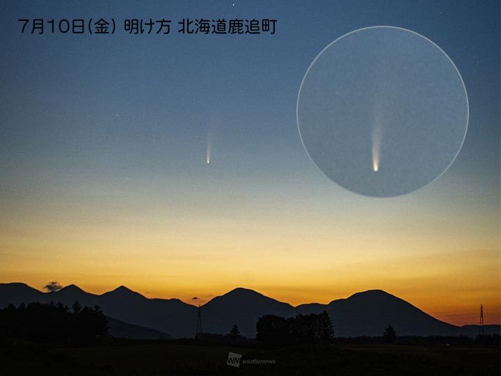 薄明の空に尾を引く“ほうき星”、ネオワイズ彗星が見ごろを迎えています。 日本から見える彗星としては近年にない明るさで、観測条件の良い場所からはその姿が肉眼で見えるほどになっています。双眼鏡を使うと長く伸びた尾もよく視認できます。 この写真は北海道のウェザーニュースユーザーが7月10日(金)の明け方に撮影したものです。朝焼けを背景に然別火山群の上に昇るネオワイズ彗星は、空が明るくなっていて目視はギリギリだったとのことです。