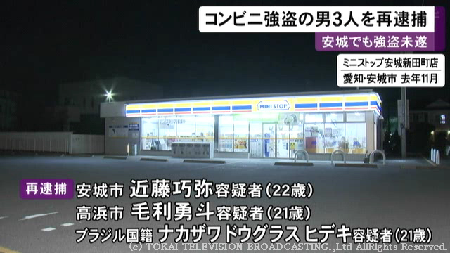 再逮捕されたのは、愛知県安城市の作業員近藤巧弥容疑者(22)ら3人で去年11月、安城市の「ミニストップ安城新田町店」にバールを持って押し入り男性店員(当時38)を脅した上、現金を奪おうとした疑いが持たれています。