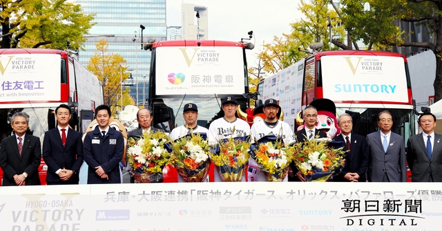 プロ野球の阪神タイガースとオリックス・バファローズのリーグ優勝を祝うパレードが23日、大阪・御堂筋と神戸市で行われた。大阪会場では、おそろいのジャンパーを着て懸命に来場者の対応にあたる大阪府と大阪市の職員の姿が見られた。